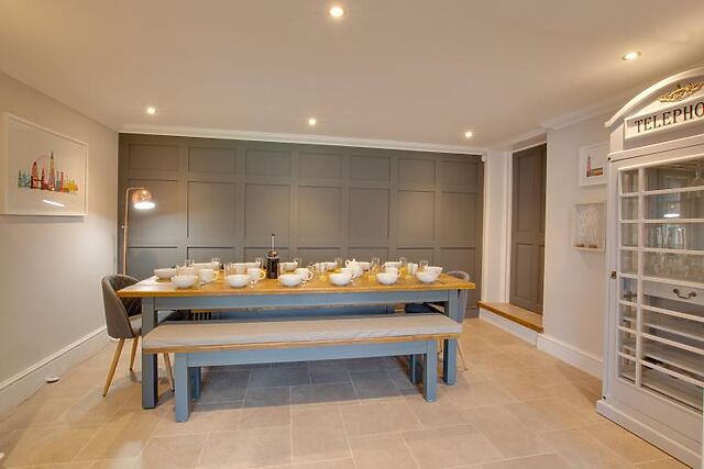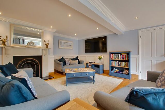 The ground floor features a well-equipped kitchen with modern appliances, including an oven, hob, microwave, and coffee machine. The large lounge/diner is perfect for socialising, complete with a Smart TV, dining table, and even a piano. Two double bedrooms and a family bathroom with a roll-top bath complete the ground floor.