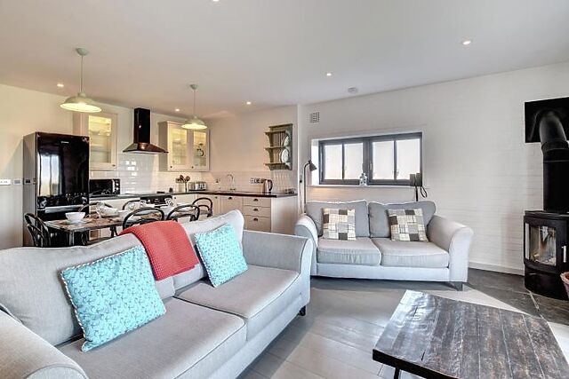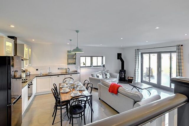 The property consists of two separate cottages, each finished to a high standard with spacious open-plan living areas, well-equipped kitchens, and cosy wood burners.