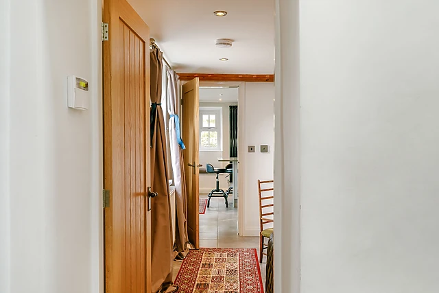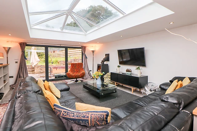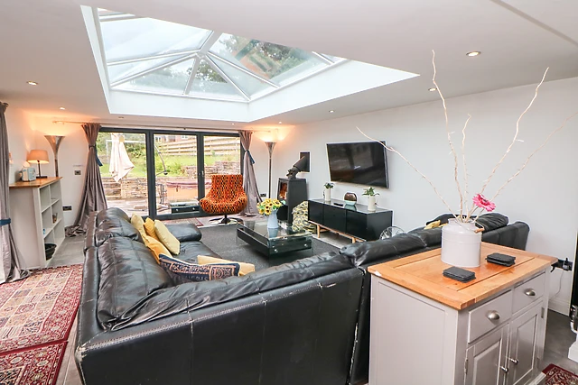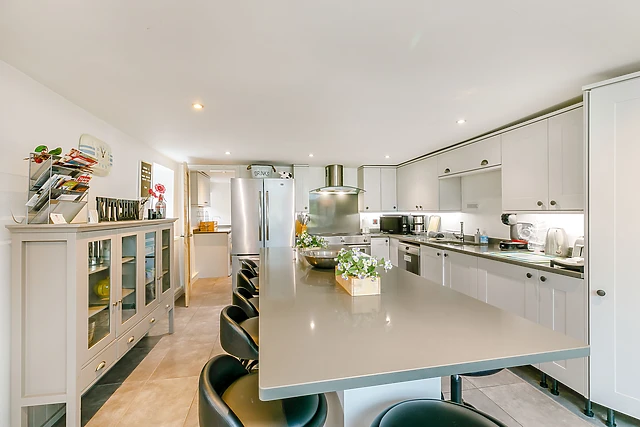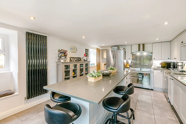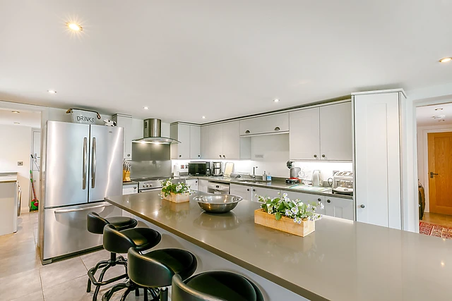 The open-plan living space boasts a breakfast bar at its island to enjoy a hearty meal in the morning time, as well as a snug corner sofa overlooking the enchantment of the garden. Head into the living/dining room where you will find a long, rustic table, ideal for hosting a delicious home-cooked treat prepared in the contemporary-styled kitchen.