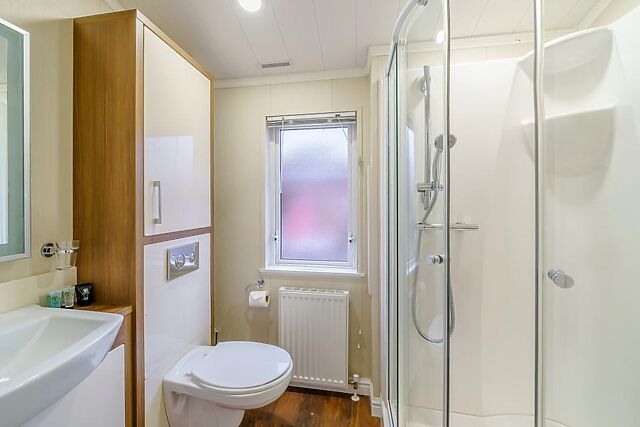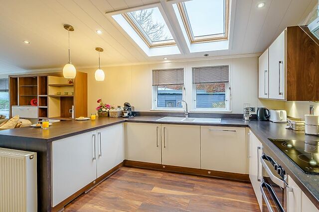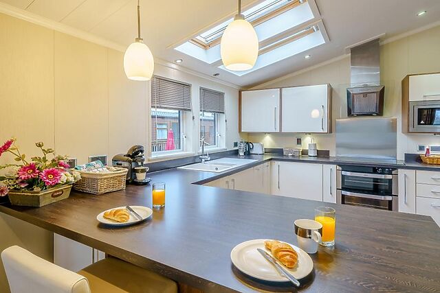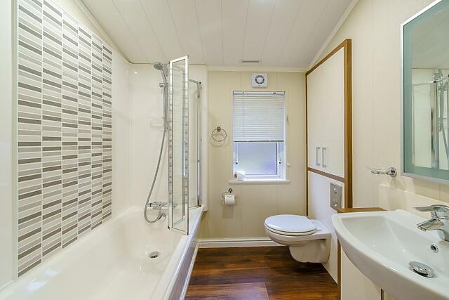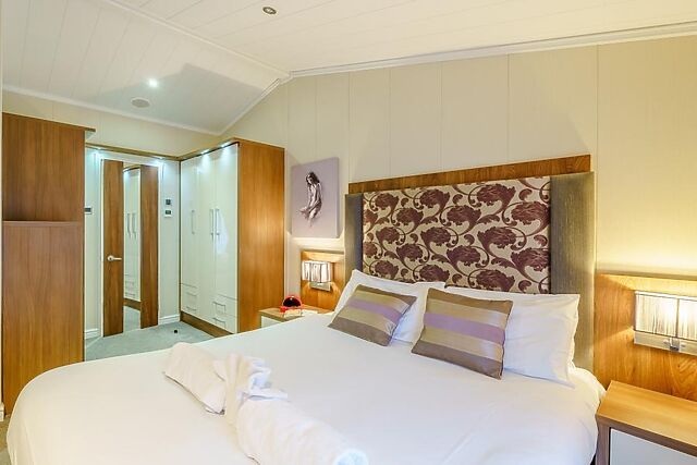 The lodge boasts two bedrooms, one with a king-size bed and an en-suite shower room, and another with twin beds, catering to a variety of sleeping arrangements.