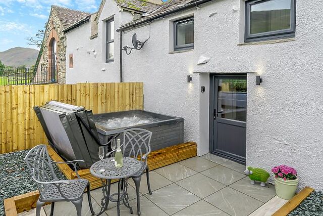 The property features a private hot tub, ideal for unwinding after a day of exploring the stunning surroundings.