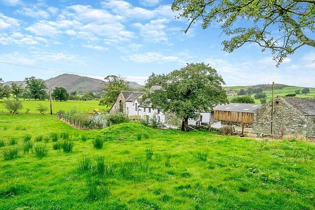 Upstairs, the master suite offers a beamed ceiling, low windows, and slate window sills with views over the fells.