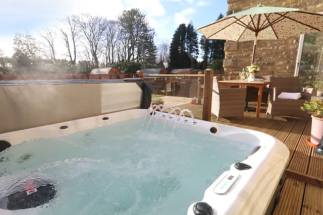 Yes, the accommodation features a delightful private hot tub on the decked balcony area, offering guests a luxurious spot to unwind and enjoy the surrounding views.
