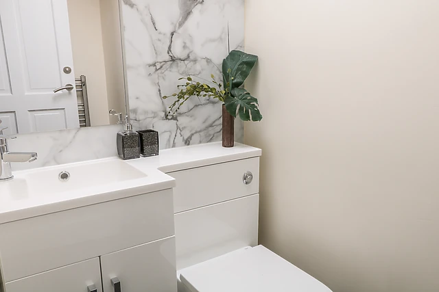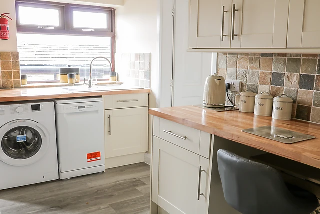 The modern kitchen, complete with a breakfast bar, sets the scene for intimate moments over home-cooked meals. The property also features a private hot tub, offering the ultimate relaxation under the stars in the rear enclosed courtyard.