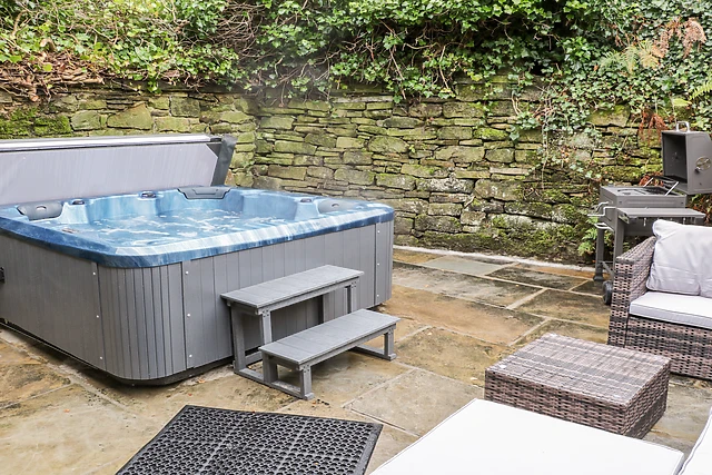 Yes, the accommodation includes a private hot tub in the rear enclosed courtyard, providing guests with a luxurious spot to relax and unwind during their stay.