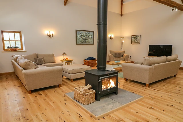 The heart of the barn is the first-floor open-plan living space, complete with a woodburning stove that adds a warm glow to your evenings.