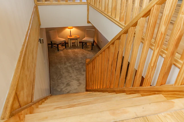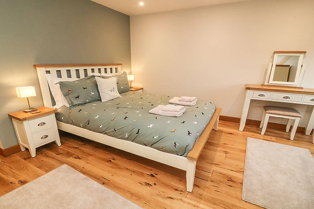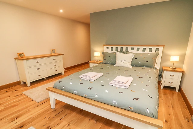 The heart of the barn is the first-floor open-plan living space, complete with a woodburning stove that adds a warm glow to your evenings. The fully-equipped kitchen invites you to prepare delicious meals, while the dining area is perfect for gathering and making memories.
