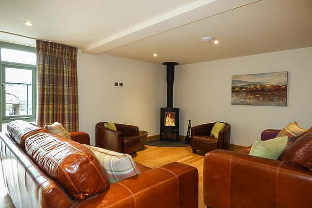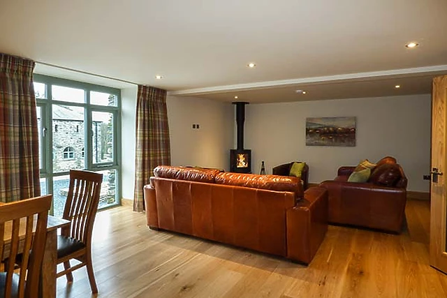 Enjoy the views from the large window to the courtyard or from the window seat. Relax in leather settees in front of a warming woodburner and oak floor.