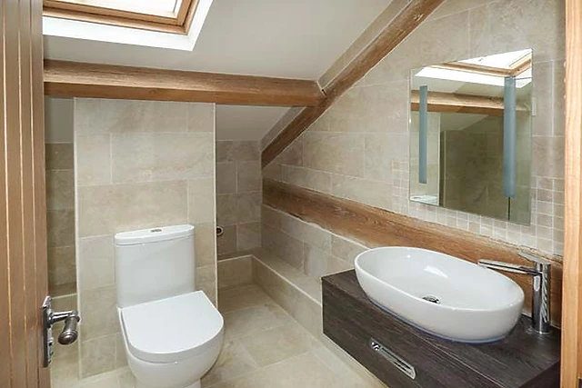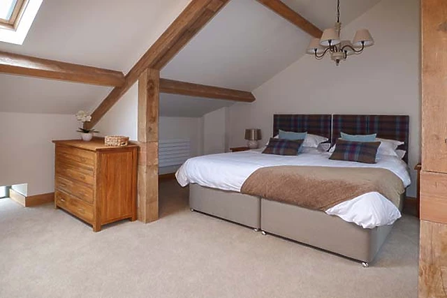 Upstairs from the sitting room there are two further bedrooms, both en-suite. Both these have quirky walls and windows, sloping ceilings, remote blinds to the Velux windows and wonderful wooden beams within the walls that have been meticulously maintained and restored.