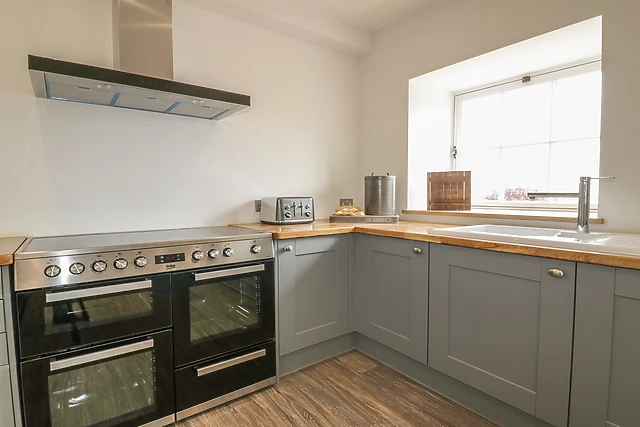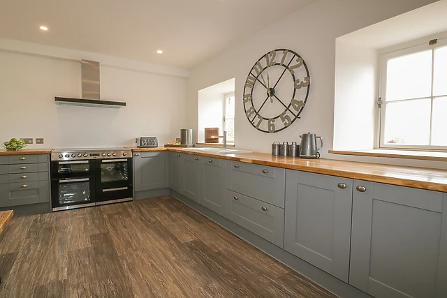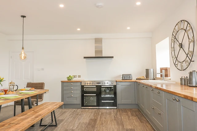 The bedrooms consist of a choice of doubles, twin, bunk room and super king-size double, offering flexible sleeping, and complete with underfloor heating throughout the ground floor. There is a spacious and well-equipped kitchen with a dining area, which has a large rustic reclaimed table with two benches and chairs boasting sea views for all guests to enjoy and cook up some delicious home-cooked meals.