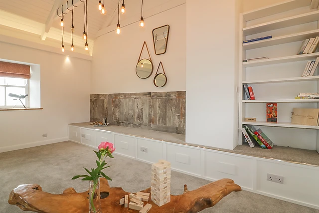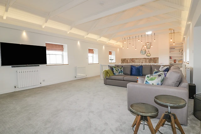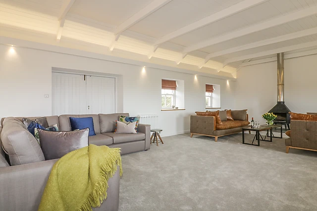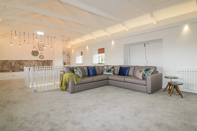 The first floor provides a large lounge area, which is simply stunning with its high-vaulted beamed ceilings, including bespoke LED lighting and unrivalled sea views over the front of the property and the rolling fields flanking the rear. There are two large leather sofas next to the woodburning stove, a great resting spot with your glass of wine and a book, or for a quiet chat with friends.