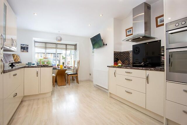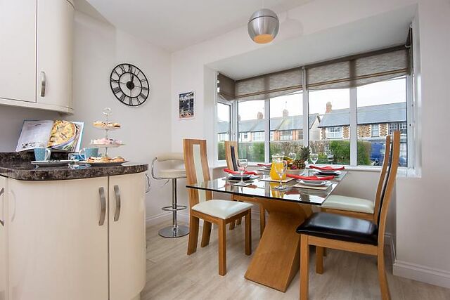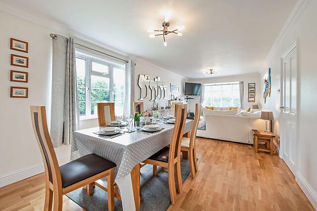 Relax in the spacious lounge/dining area, complete with a Smart TV and bay windows overlooking the garden.