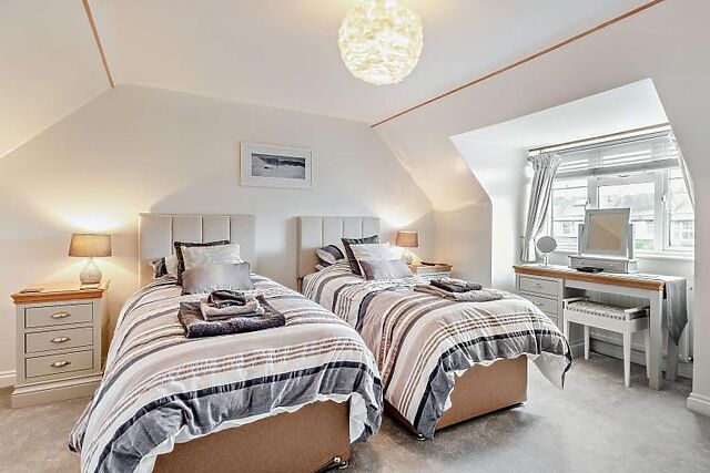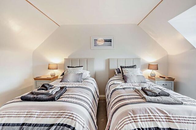 Upstairs, there is a super-king-size bedroom and a twin bedroom with zip-and-link beds that can be converted into a super-king-size upon request. The family bathroom includes a bath, separate shower, and WC.