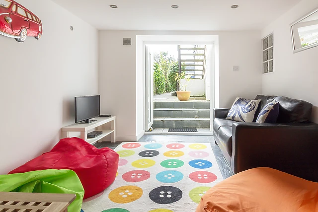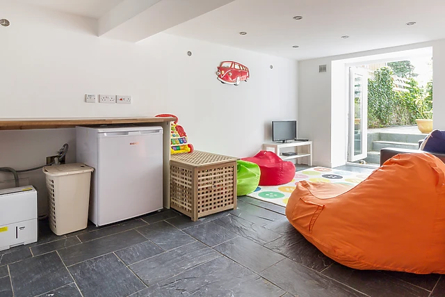The sitting room provides a welcoming, social area to sit and relax, and has side views from the extending dining table, through a large bay window, to the superb sandy main beach in Rhosneigr village. On the lower ground floor there is a children’s play room, with patio doors into the garden, equipped with a toy box, a two-seater sofa and bean bags, plus a TV/DVD.