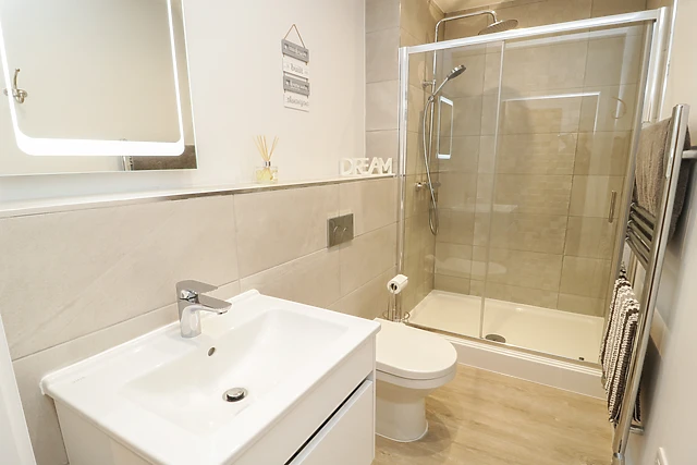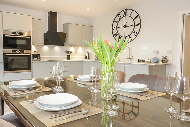 The open-plan kitchen/diner is a culinary haven, equipped with state-of-the-art appliances and a Smart TV, leading out to an enclosed garden where alfresco dining becomes a delightful option.