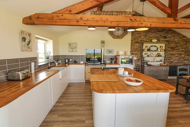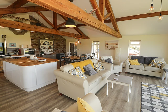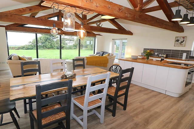 Be welcomed into the open-plan living space where a backdrop of distant sea views greets you from behind the large glass picture windows next to the sitting area, creating a tranquil spot to wind down. Gather around the large dining table in here beneath the feature lighting and large beamed ceiling, after cooking up something delicious in the beautiful kitchen, where a stylish kitchen island presents a great spot to open up a bottle and toast to your holiday.