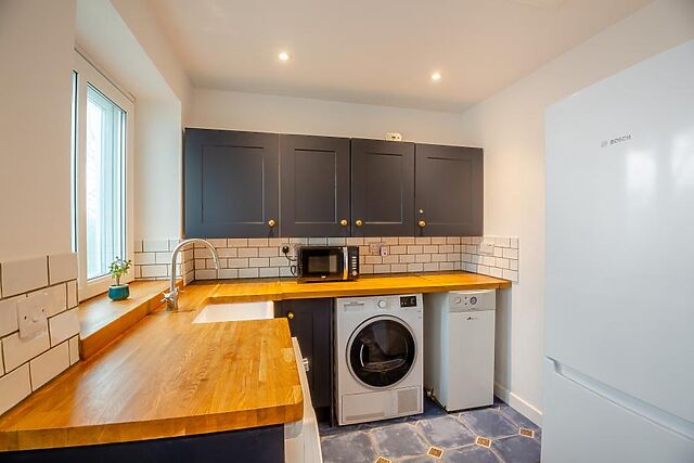 There is an oak Welsh settle to sit on to change shoes and a bookcase with a collection of old and new books to browse at your leisure. Kitchen: The newly renovated kitchen with original quarry tiled floor is dark blue with solid oak worktop.