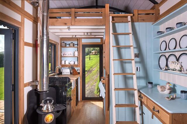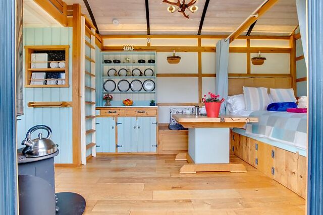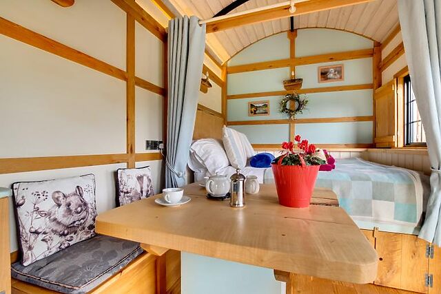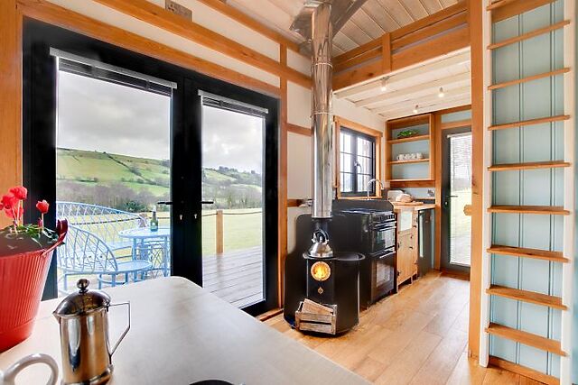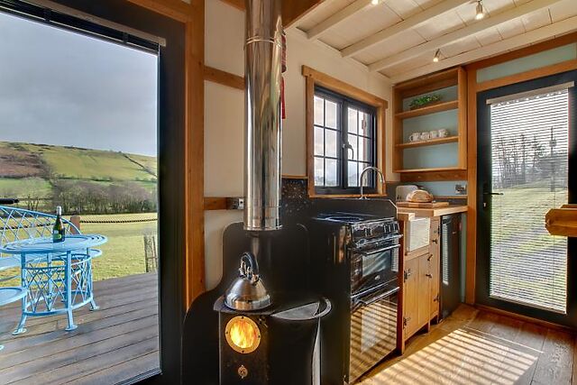 Inside, you'll find a king-size bed with stunning views of the rolling fields, a fully equipped kitchen, and a dining area with a fold-away table and cushioned bench seating. The wood burner adds a touch of warmth, making it a perfect spot to relax.