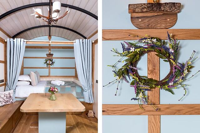 The handcrafted cabin, made from Welsh oak and red cedar, offers a warm and inviting atmosphere.
