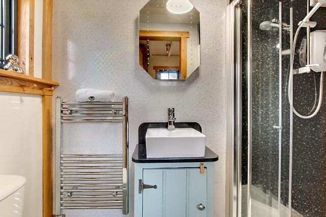 Inside, you'll find a king-size bed with stunning views of the rolling fields, a fully equipped kitchen, and a dining area with a fold-away table and cushioned bench seating. The wood burner adds a touch of warmth, making it a perfect spot to relax. The cabin also features a stylish bathroom with a full-sized shower unit.