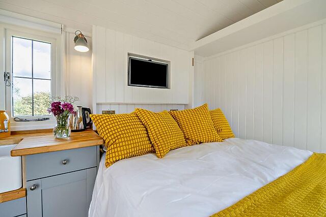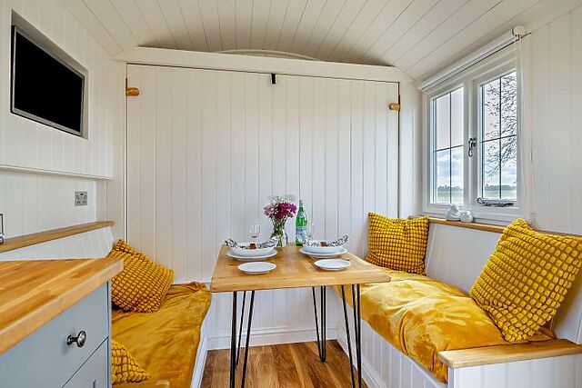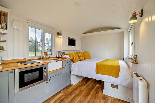 Inside, you'll find a well-designed space featuring tongue-and-groove walls, a traditional curved roof, and stylish fixtures. The open-plan layout includes a compact kitchen, perfect for preparing intimate meals, and a comfortable seating area with a Smart TV for entertainment.