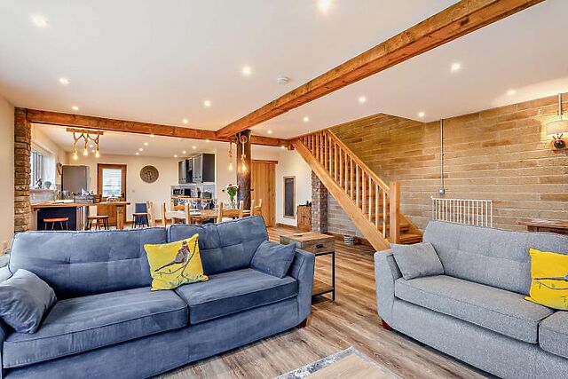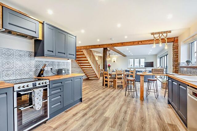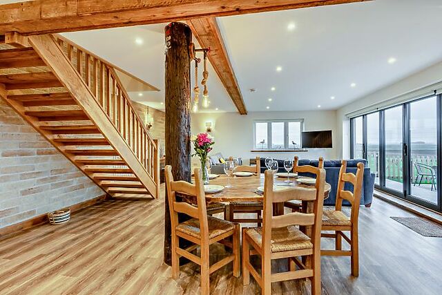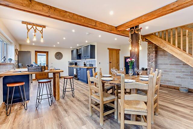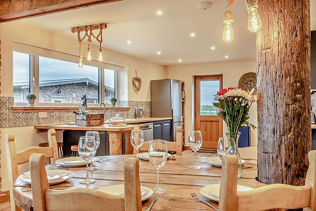 After a day of exploring, unwind in the enclosed courtyard, where a six-seater hot tub awaits. The courtyard also boasts stunning rural views, making it the perfect spot for relaxation. The kitchen is fully equipped for all your culinary needs, and the dining area is ideal for enjoying meals together.