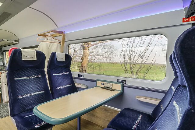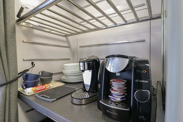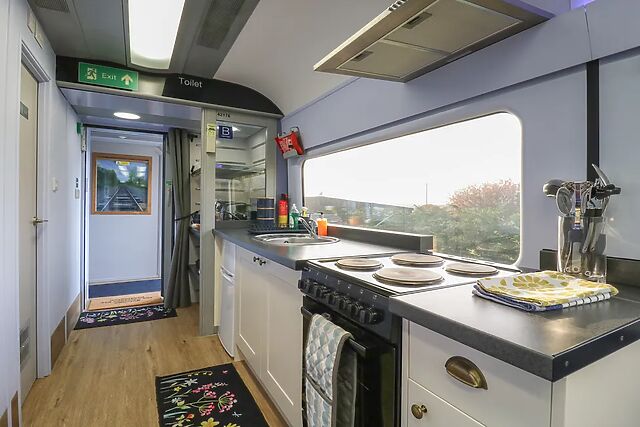 Step inside to discover a light and open studio-style layout featuring original carriage details, including overhead lights, bag compartments, and traditional seating. The kitchen is equipped with the essentials needed to prepare meals, while the dining area provides space to enjoy dishes together before planning the day.