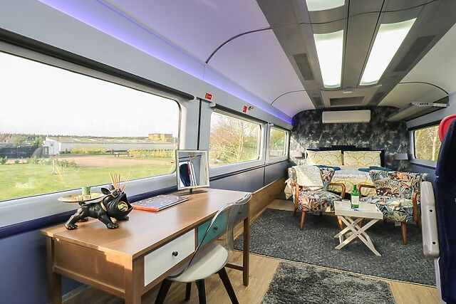 The sitting area offers a place to relax after exploring the surrounding area. Positioned at the rear of the carriage is a king-size bed, with a window above fitted with a blind, allowing guests to look towards the night sky from the covers if they choose.