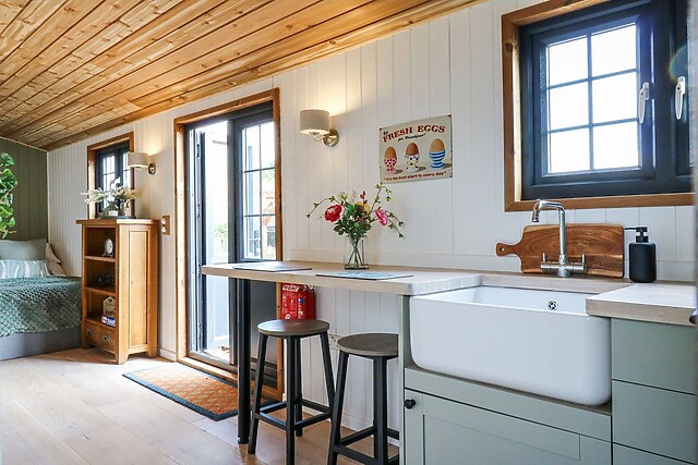 Park the car and make your way across the large field to your new abode. Enter the lodge to find a neat kitchen, store any treats in the fridge for your getaway and whip up a feast using the electric hob.
