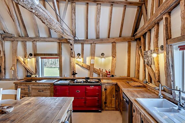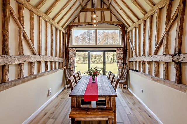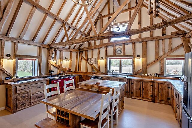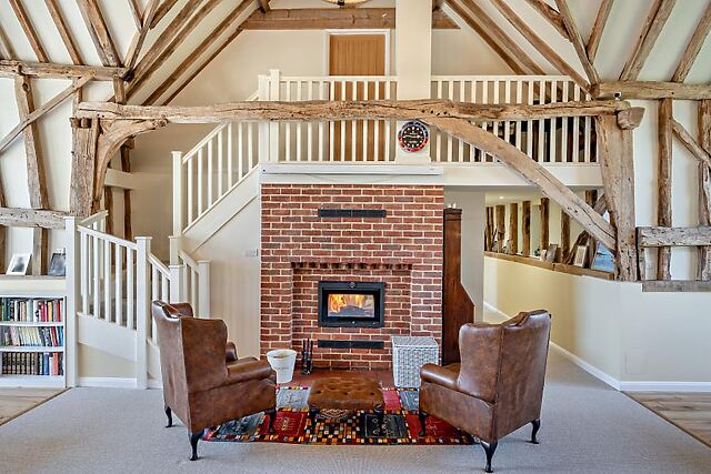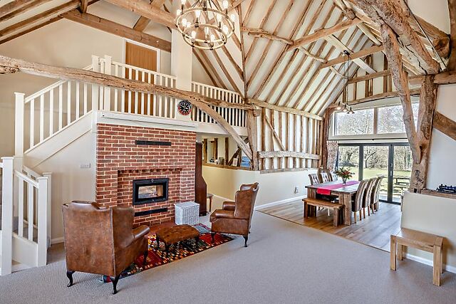 At the heart of the house lies a striking double-height, open-plan living space, showcasing impressive beams, ancient trusses and an abundance of natural light. Comfortable seating faces a projector for memorable movie nights, while a wood burner adds warmth, and a games area with a pool table ensures hours of entertainment.