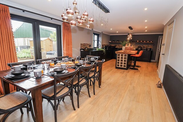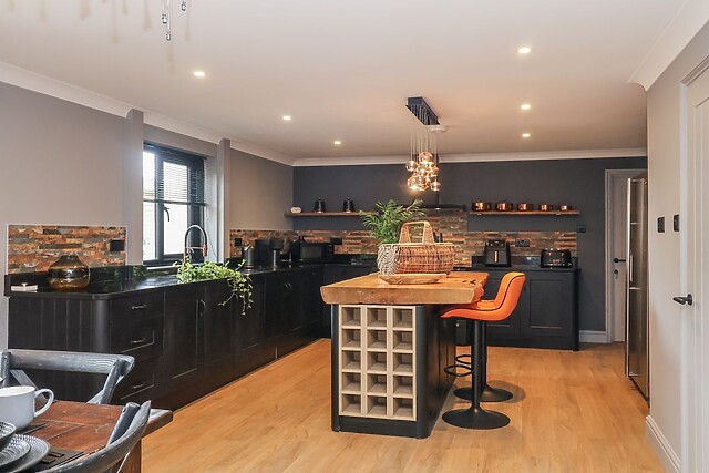 The heart of the home is the kitchen/diner, fully-equipped with everything you need to prepare delightful meals, which can be enjoyed at the dining table. Gather around the sleek breakfast bar, topped with a rustic and stylish wooden countertop and accented with black fixtures, to chat over fresh pastries or plan the day’s adventures while breakfast sizzles on the stove.