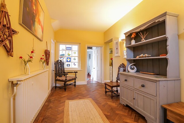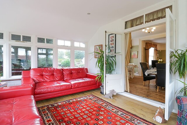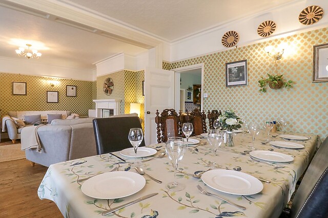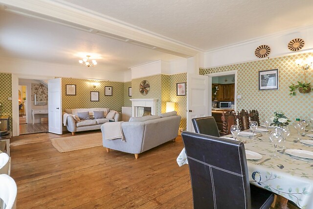 Adjacent to the kitchen, you'll find a handy utility room housing a washing machine, tumble dryer, and an American fridge/freezer, ensuring you have all the amenities needed for a pleasant stay. The heart of the home is undoubtedly the expansive living/dining room, complete with 2 large dining tables (to seat up to 24) for family meals together, 2 sofas and a TV, and the adjacent sunroom with 2 further sofas and wrap around views of the beautiful South-facing garden.