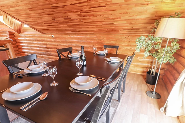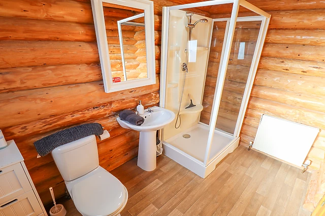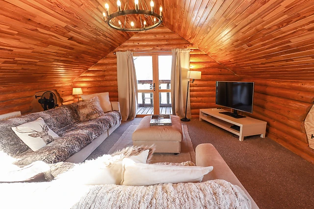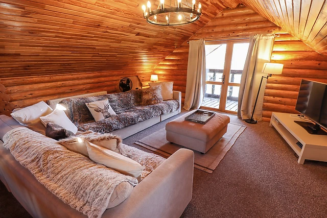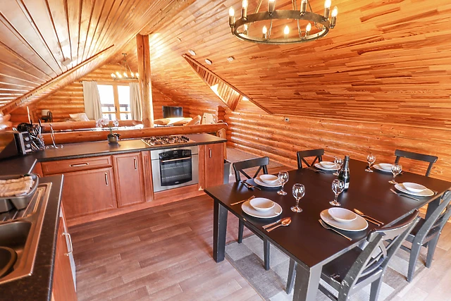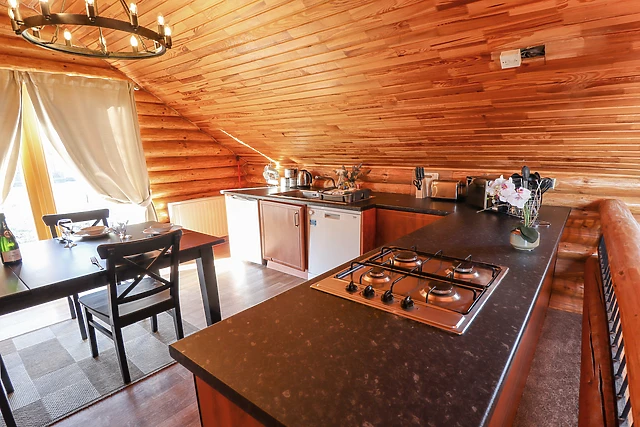 Ascend to the first-floor open-plan living space, where you'll find a fully-equipped kitchen, dining area, and a snug sitting area, ideal for family gatherings. The lodge's unique design includes clever cut-out walls, doubling as storage or a secret den for the little ones.