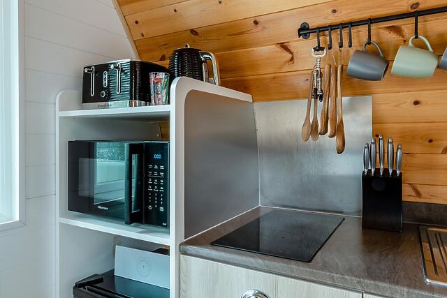 The bright and peaceful lounge area has a Smart TV and comfortable seating, perfect for cosy night in after a day’s fishing. There’s a handy kitchenette opposite, complete with a range of useful equipment.
