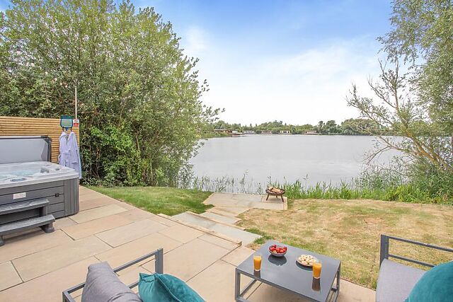 Back outside, the pod has a delightful private garden area which leads down to the lake’s edge. This tranquil spot has a patio with outdoor furniture and a fire pit, perfect for dining alfresco.