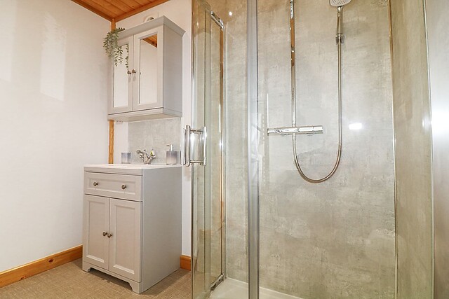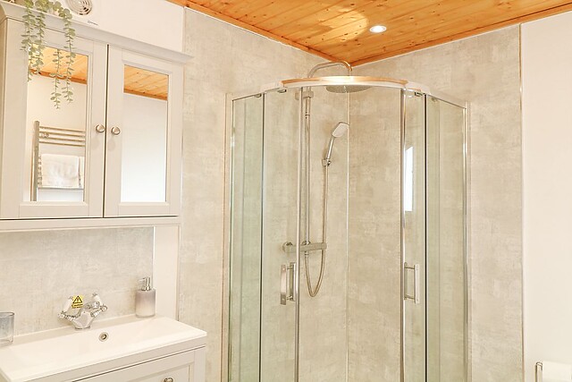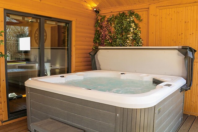 The bathroom, complete with a bath and shower over, provides a lovely space to refresh and rejuvenate. Step outside through the patio doors onto the decking where you can revel in the outdoor ambience and take a dip in the inviting hot tub.