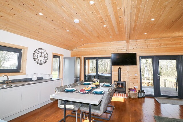 Inside, the lodge features a delightful open-plan living space with a well-equipped kitchen, a dining area, and a sitting area where you can relax and enjoy the homely ambience. The two bedrooms offer plenty of space to rest those sleepy heads, including a king-size bedroom with an en-suite walk-in shower, as well as a twin bedroom.