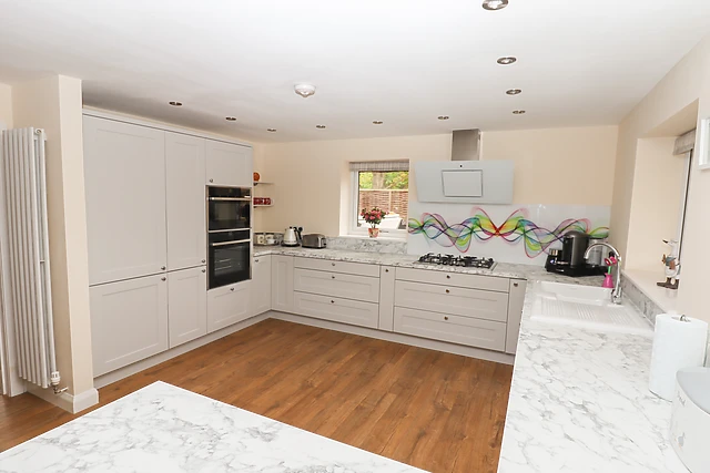 The kitchen is equipped with modern appliances, including an electric oven, gas hob, and even a dishwasher, making meal preparation a breeze.