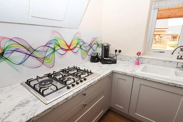 The kitchen is equipped with modern appliances, including an electric oven, gas hob, and even a dishwasher, making meal preparation a breeze. Step outside onto the extensive wrap-around decking, where you can indulge in alfresco dining or sink into the private hot tub under the starry sky.