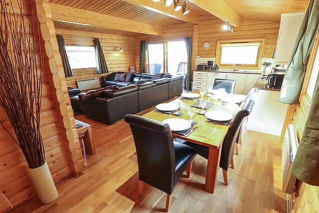 The main bathroom features a bath with a rainfall shower over, basin, and WC, providing a space to unwind after a day of exploring. The heart of the lodge is the open-plan living space, which includes a well-equipped kitchen, a dining area, and a sitting area with an L-shaped sofa, set up for relaxing with loved ones.