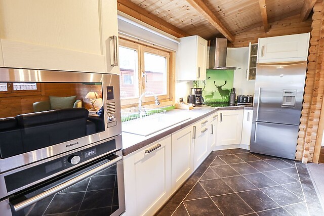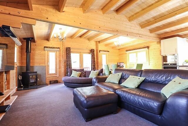 Make your way through the park to find the private parking just outside the lodge for unloading your luggage. Take the steps up to the decking, leading inside into the open-plan living space where the majority of your socialising can take place.