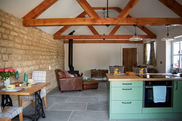 Upon entering, the open-plan sitting area greets you with exposed beams and plush, comfortable seating, while the crackling wood burner sets a delightful ambience for the evening. The bespoke kitchen, showcasing a beautiful oak worktop, invites you to create delightful meals for two.