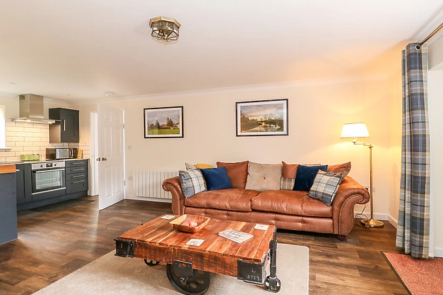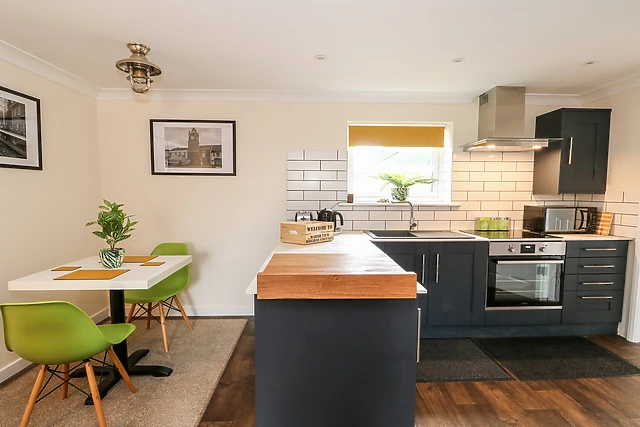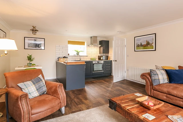 The open-plan living space, adorned with an electric fire, sets the stage for cosy evenings in, while the smart kitchen awaits your culinary flair.