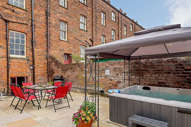Yes, this traditional townhouse boasts a bubbling hot tub in the private walled courtyard, perfect for relaxing evenings with friends or family.