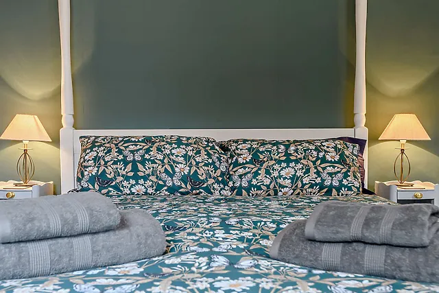 The accommodation comprises three bedrooms: one with a four-poster king-size bed, another with a king-size bed, and a twin room, ideal for families or groups.