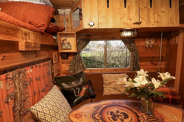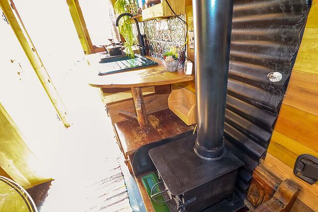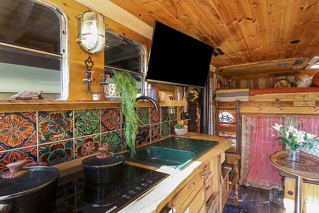 Climb the steps and be welcomed into a wood-clad space, with colourful patterns throughout the decor, and tasteful tiles and ornaments adding to the homely, unique feel. Inside the van you will find a sitting area with a table, a space from which you can enjoy a coffee or romantic meal for two, an the kitchen has a good selection of amenities to cater to your needs, as well as the glowing ambiance of a woodburning stove.