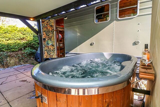 The space benefits from a wet room, as well as a raised double bed, reachable by a ladder, surrounded by beautiful, stained wood. This incredible van offers a wonderful outside space to match, boasting a bubbling hot tub ideal for those cooler evenings gazing out across the garden and towards the stars.