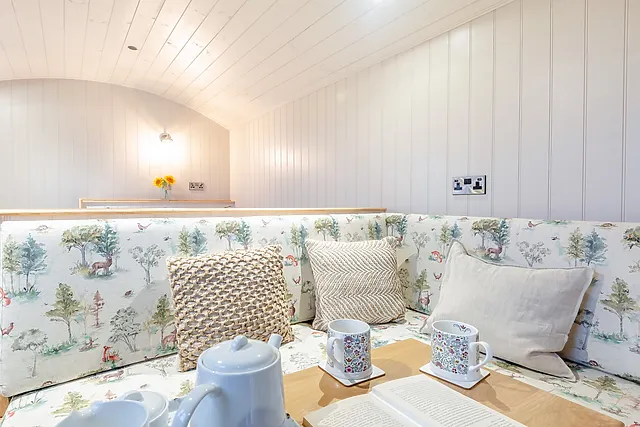 The interior boasts wood-panelled walls and colourful soft furnishings, creating a cosy and inviting atmosphere.