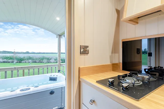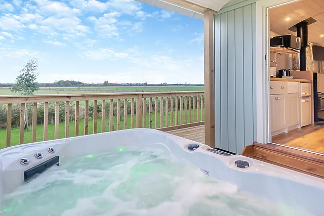 Yes, the accommodation boasts a private hot tub on the raised decking area, offering guests the luxury of soaking in the bubbles while enjoying the stunning countryside views.