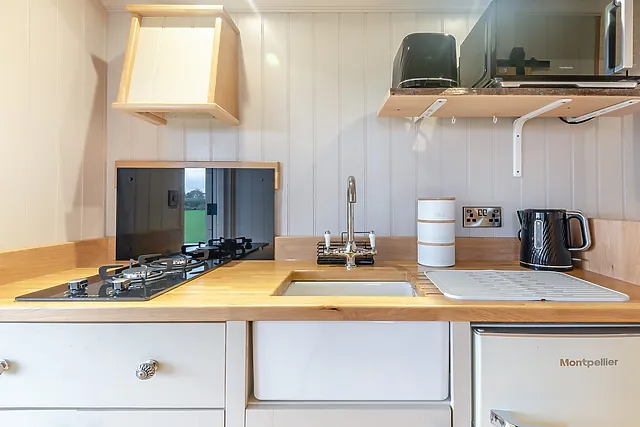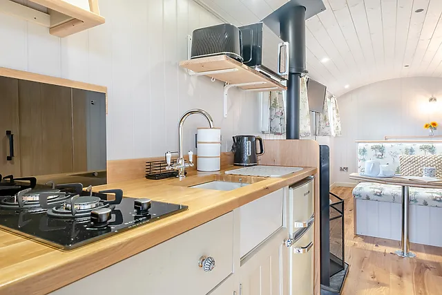 The compact kitchen area is equipped with a two-ring electric hob, a microwave/oven, and a fridge with an ice compartment, catering to guests' basic cooking needs.
